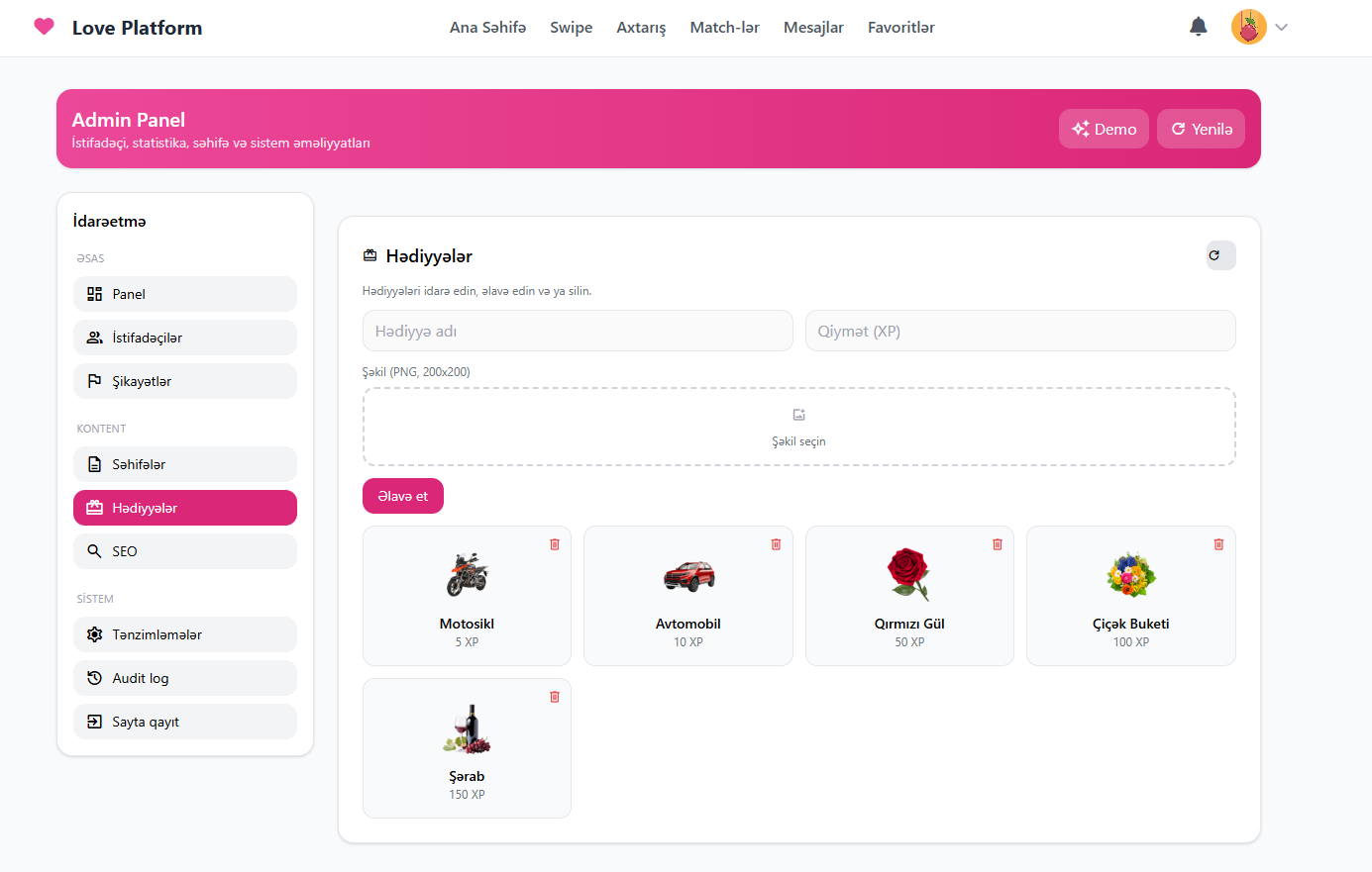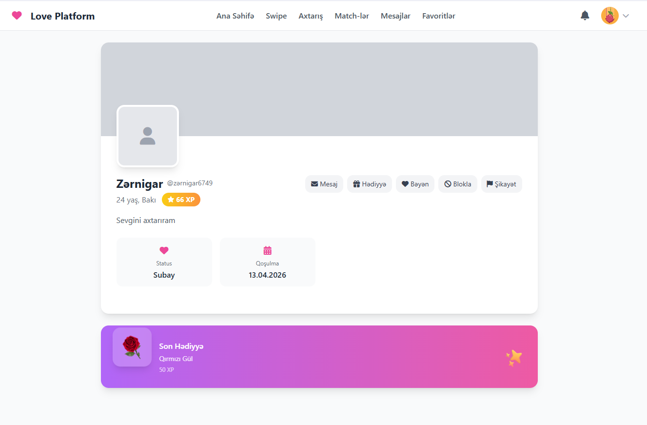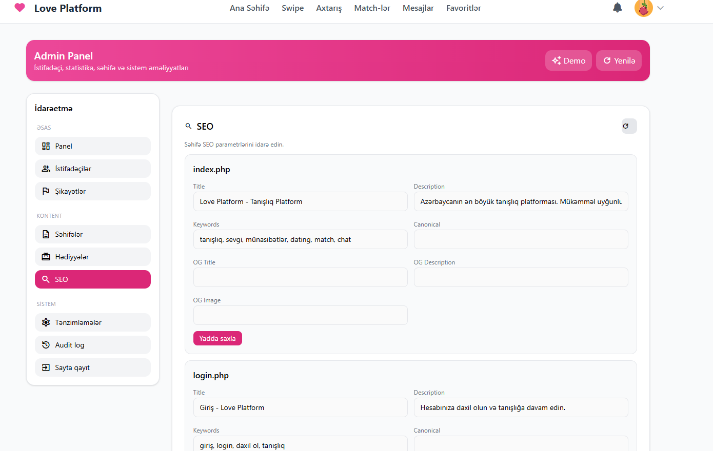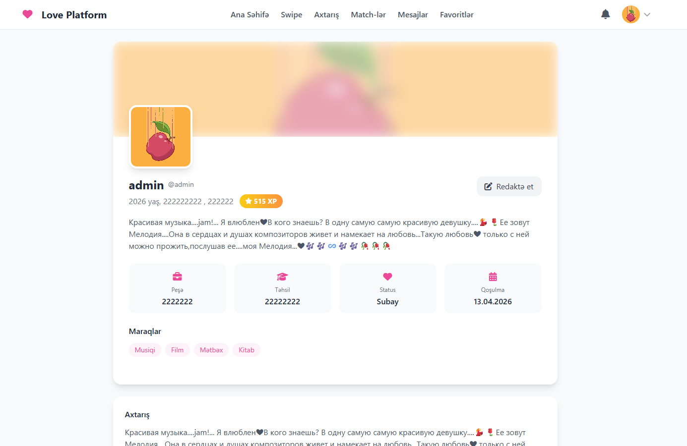 LoveCMS — müasir onlayn tanışlıq platforması qurmaq üçün hazırlanmış, tam funksional və geniş imkanlara malik bir CMS (Content Management System) sistemidir. Bu sistem istifadəçilərə asanlıqla qeydiyyatdan keçmək, profil yaratmaq, özlərini şəkil və bio ilə təqdim etmək, maraq dairələrini seçmək və digər istifadəçilərlə əlaqə qurmaq imkanı verir. Platformanın əsas üstünlüklərindən biri “match” mexanizmidir — istifadəçilər swipe (sağa/sola sürüşdürmə) vasitəsilə digər profilləri bəyənə və ya keçə bilir, qarşılıqlı bəyənmə olduqda isə sistem avtomatik olaraq onları “match” edir və ünsiyyət qurmağa şərait yaradır.Mesajlaşma sistemi real-time işləyir və istifadəçilər arasında ani yazışmanı təmin edir, həmçinin mesajların oxunma statusu və bildirişlər funksiyası ilə daha interaktiv təcrübə yaradır. Axtarış və filtr sistemi olduqca genişdir — istifadəçilər yaş, şəhər, məsafə, online status və maraqlara görə digər profilləri dəqiq şəkildə tapa bilirlər. Bu isə platformanın istifadəçi təcrübəsini ciddi şəkildə artırır və daha uyğun nəticələr əldə etməyə kömək edir.
