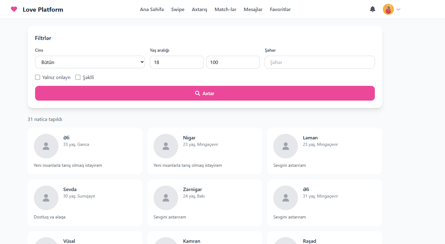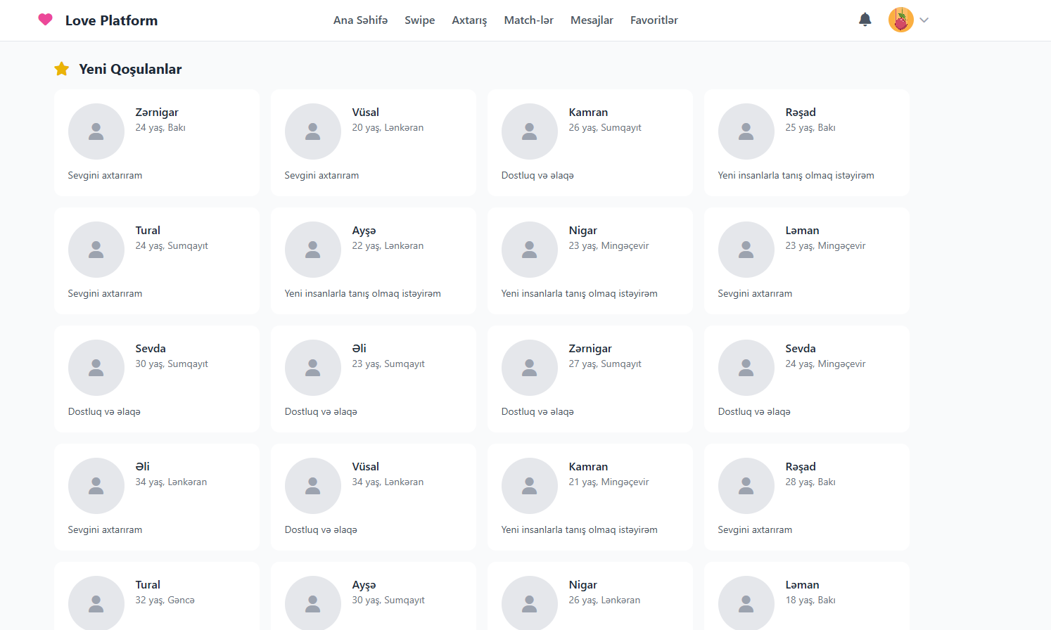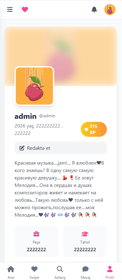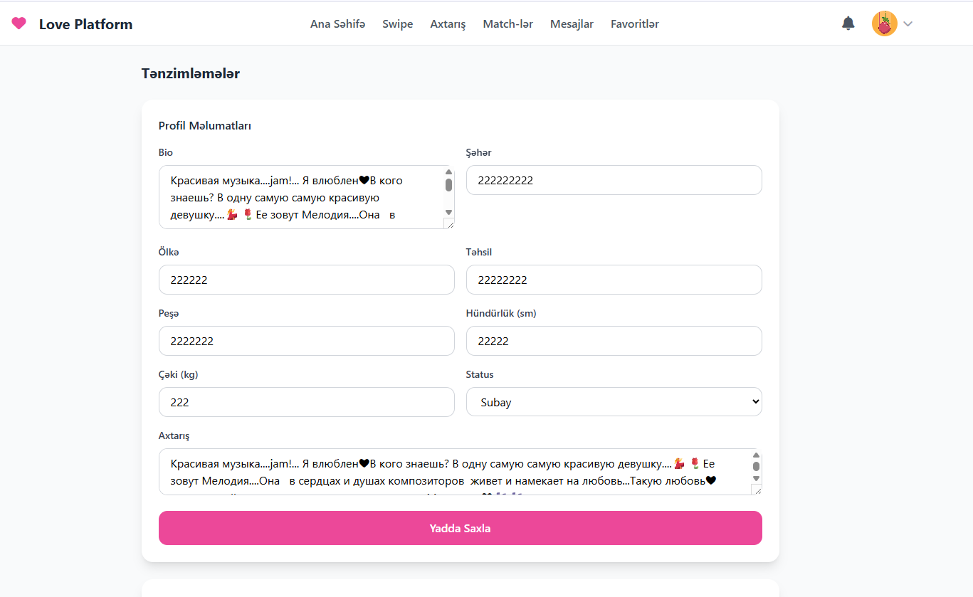 LoveCMS — müasir onlayn tanışlıq platforması qurmaq üçün hazırlanmış, tam funksional və geniş imkanlara malik bir CMS (Content Management System) sistemidir. Bu sistem istifadəçilərə asanlıqla qeydiyyatdan keçmək, profil yaratmaq, özlərini şəkil və bio ilə təqdim etmək, maraq dairələrini seçmək və digər istifadəçilərlə əlaqə qurmaq imkanı verir. Platformanın əsas üstünlüklərindən biri “match” mexanizmidir — istifadəçilər swipe (sağa/sola sürüşdürmə) vasitəsilə digər profilləri bəyənə və ya keçə bilir, qarşılıqlı bəyənmə olduqda isə sistem avtomatik olaraq onları “match” edir və ünsiyyət qurmağa şərait yaradır.Mesajlaşma sistemi real-time işləyir və istifadəçilər arasında ani yazışmanı təmin edir, həmçinin mesajların oxunma statusu və bildirişlər funksiyası ilə daha interaktiv təcrübə yaradır. Axtarış və filtr sistemi olduqca genişdir — istifadəçilər yaş, şəhər, məsafə, online status və maraqlara görə digər profilləri dəqiq şəkildə tapa bilirlər. Bu isə platformanın istifadəçi təcrübəsini ciddi şəkildə artırır və daha uyğun nəticələr əldə etməyə kömək edir.