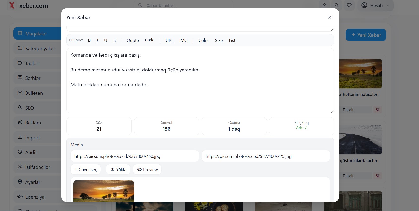 MUGALOV XƏBƏR, müasir və peşəkar xəbər platformaları yaratmaq üçün nəzərdə tutulmuş CMS skriptidir. Bu sistem WordPress və Drupal kimi platformalara alternativ olaraq təqdim olunur. Platforma PHP və MySQL texnologiyaları üzərində işləyir və yüksək performans üçün optimizasiya edilib. Məqalə idarəetmə sistemi istifadəçilərə rahat yazı yaratmaq və redaktə imkanı verir. Rich text editorlar (TinyMCE və CKEditor) məzmunu formatlamağa kömək edir. Qalereya və video əlavə etmək imkanı mövcuddur. Multi-kateqoriya dəstəyi ilə məqalələr müxtəlif bölmələrdə yayımlana bilir. Tag və etiket sistemi SEO və naviqasiyanı asanlaşdırır. Planlaşdırılmış dərc funksiyası xəbərləri əvvəlcədən təyin edilmiş vaxtda yayımlamağa imkan verir. Media menecment sistemi geniş imkanlara malikdir. Şəkil qalereyaları yaratmaq və idarə etmək mümkündür. Video embed funksiyası ilə YouTube və Vimeo videolar əlavə olunur. Otomatik thumbnail yaradılması media idarəsini sadələşdirir. Watermark funksiyası şəkillərin qorunmasını təmin edir. Bulk image upload çoxlu şəkilləri eyni anda yükləməyə imkan verir. Şərhlər sistemi istifadəçi interaktivliyini artırır. Nested şərhlər cavabları daha aydın göstərir. Moderasiya paneli şərhləri idarə etməyə kömək edir. Spam filter istifadəçi təcrübəsini qoruyur. User reytinqinə əsaslanan prioritet şərhlər sistemi aktiv istifadəçiləri önə çıxarır. SEO optimizasiyası saytın axtarış sistemlərində görünməsini artırır. SEO-friendly URL-lər platformanın indekslənməsini yaxşılaşdırır. Avtomatik meta tag generator hər məqaləni optimallaşdırır. Sitemap.xml generator saytın strukturunu axtarış motorlarına təqdim edir. RSS feed istifadəçilərə xəbər yeniliklərini təmin edir. Open Graph və Schema.org markup sosial paylaşımları və SEO üçün vacibdir. Dizayn tam responsive şəkildə hazırlanıb. Mobil cihazlarda rahat istifadə imkanı mövcuddur. AMP dəstəyi planlaşdırılır, səhifə yüklənməsini sürətləndirir. Lazy loading şəkillər sayt sürətini artırır. Infinite scroll istifadəçi təcrübəsini yaxşılaşdırır. PWA hazır olması platformanı mobil tətbiq kimi işlətməyə imkan verir. Təhlükəsizlik yüksək səviyyədə təmin olunub. CSRF, XSS və SQL injection qoruması mövcuddur. Admin autentifikasiyası və brute-force qoruması əlavə təhlükəsizlik qatıdır. Analitika sistemi geniş statistika təqdim edir. Məqalə baxış statistikası izlənilir. Populyarlıq analizi xəbərlərin performansını göstərir. User behavior tracking istifadəçi davranışını izləyir. Gündəlik və aylıq hesabatlar mövcud olur. Admin panel vasitəsilə bütün idarəetmə imkanları mövcuddur. Məqalələr və kateqoriyalar rahat idarə olunur. İstifadəçilər və müəlliflər panel vasitəsilə nəzarətdə saxlanılır. Şərh moderasiyası effektiv şəkildə həyata keçirilir. Reklam idarəsi əlavə gəlir mənbəyi təmin edir. SEO səhifələri admin tərəfindən tənzimlənir. Sistem parametrləri admin tərəfindən dəyişdirilə bilir. Backup və restore funksiyaları məlumat təhlükəsizliyini təmin edir. Əlavə funksiyalar platformanı zənginləşdirir. Breaking news banner xəbərləri vurğulayır. Newsletter və abunəlik sistemi istifadəçi əlaqəsini artırır. Social media sharing xəbərlərin paylaşılmasını asanlaşdırır. Related articles funksiyası oxşar məqalələri göstərir. Axtarış funksiyası xəbərləri tez tapmağa imkan verir. Author profiles müəllifləri tanıdır. Multi-language hazırlıq müxtəlif dillərdə istifadəni mümkün edir. GDPR compliance istifadəçi məlumatlarının qorunmasını təmin edir. Texniki tələblər PHP 7.4 və yuxarı versiyaları dəstəkləyir. MySQL 5.7 və ya 8.0 ilə işləyir. cURL, PDO, GD/Imagick və digər modullar tələb olunur. Apache və Nginx serverlərində problemsiz işləyir. Minimum yaddaş tələbi 64MB olsa da 128MB tövsiyə olunur. Lisenziya modeli aylıq icarə əsaslıdır. Hər lisenziya bir domen üçün keçərlidir. Pulsuz quraşdırma dəstəyi təqdim olunur. Avtomatik yeniləmə sistemi mövcuddur. 99.5% uptime zəmanəti etibarlılığı təmin edir. Platforma müxtəlif xəbər portalları və bloqlar üçün uyğundur. Magazin saytları və korporativ bölmələrdə istifadə edilə bilər. Media agentlikləri və nəşriyyatlar üçün də uyğun həll təqdim edir. İstifadəçilər qeydiyyatdan sonra tam mənbə kodu əldə edirlər. SQL verilənlər bazası sxemi layihəni qurmağa kömək edir. Quraşdırma təlimatları AZ, RU və EN dillərində təqdim olunur. Video quraşdırma təlimatı prosesi asanlaşdırır. Demo versiya test üçün əlçatandır. Admin panel daxilində bütün funksiyalar görünür. Ümumilikdə, MUGALOV XƏBƏR güclü və funksional xəbər platformasıdır.XeberCMS v1.7.2 - Php Xeber Skripti